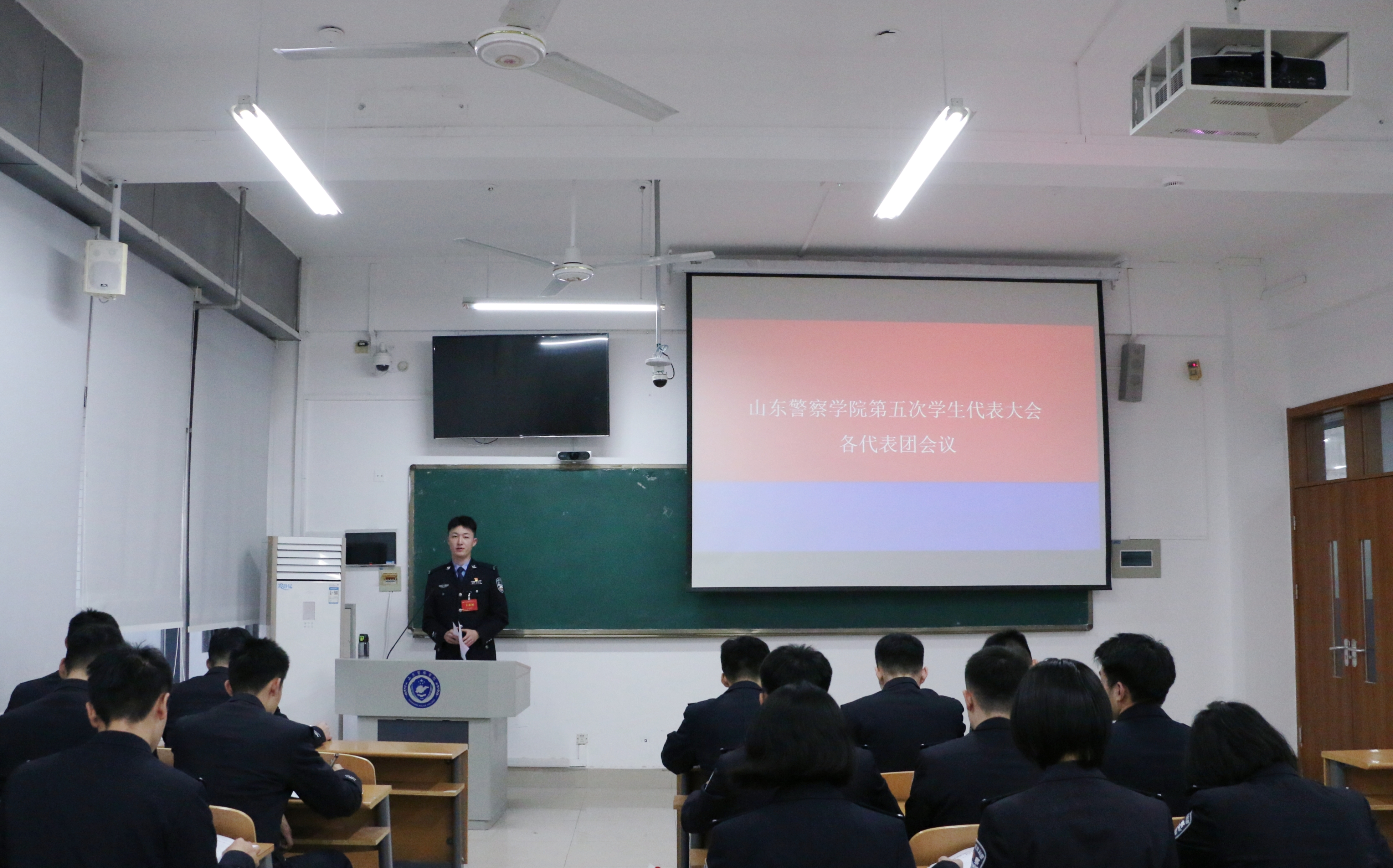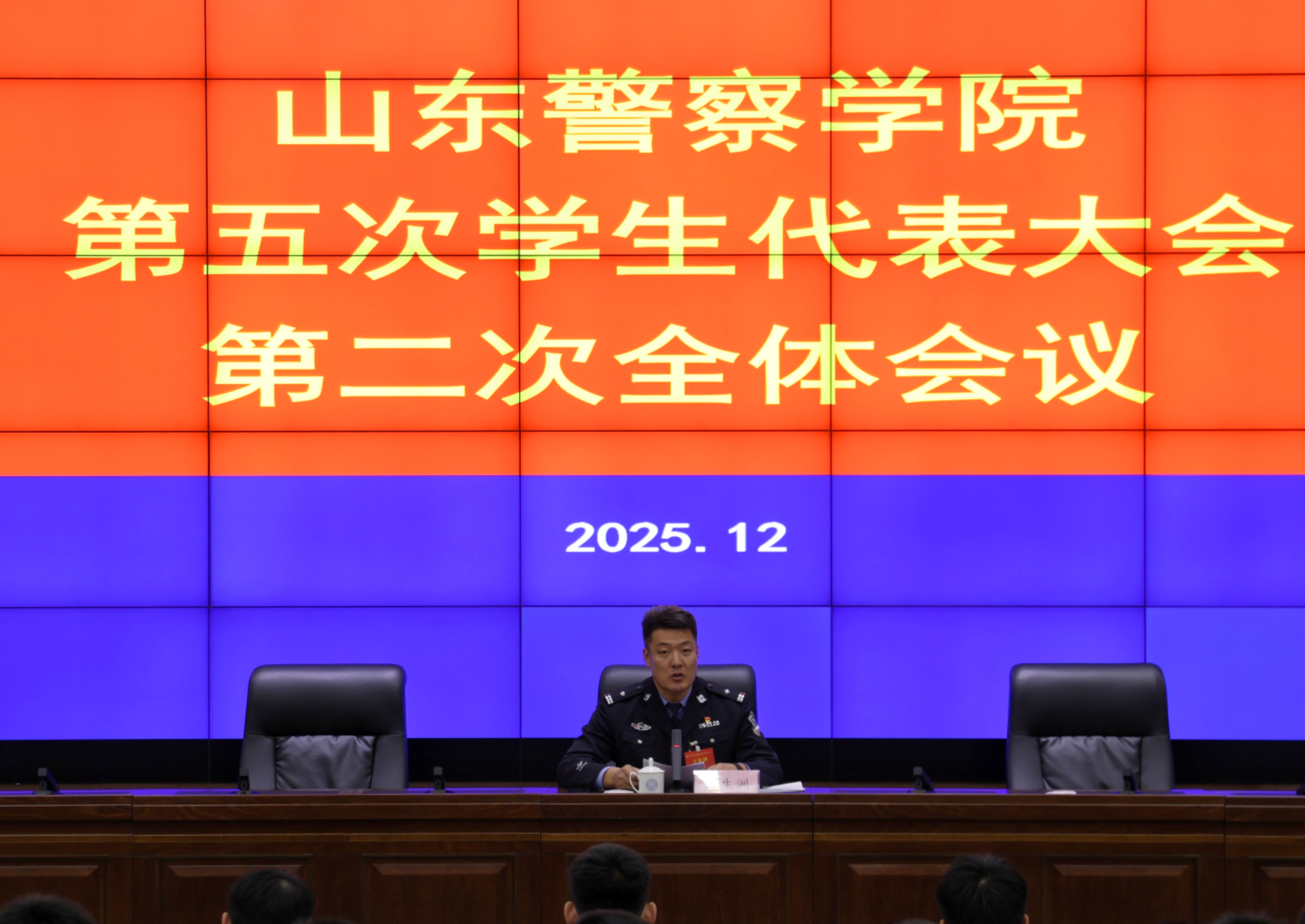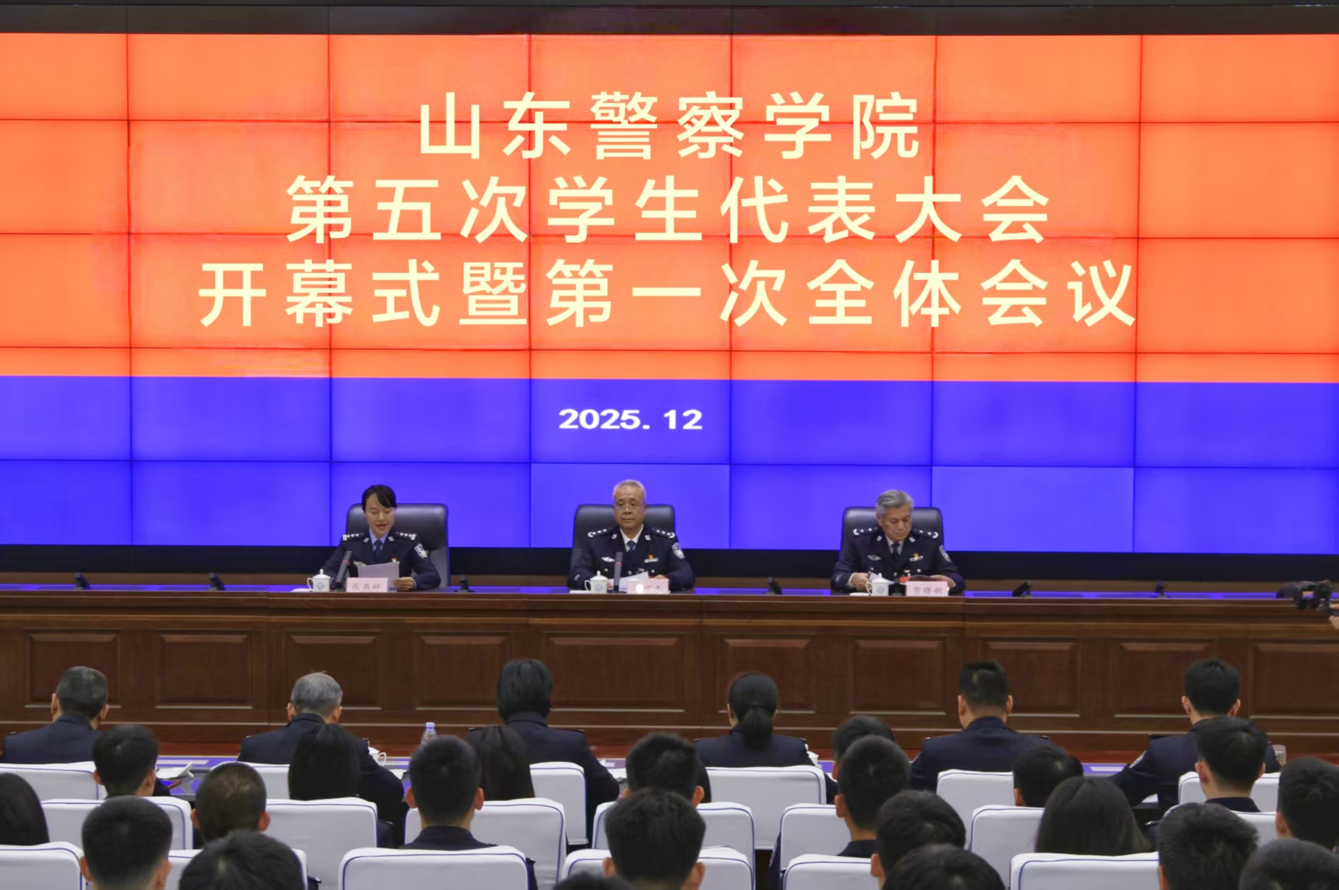 2025年12月29日,山东警察学院第五次学生代表大会在学术报告厅隆重举行。校党委副书记、院长毕可志,党委委员、副院长贺曙敏出席大会。各二级学院党委书记和党委副书记兼学生支队支队长出席,全校的优秀团员、优秀团干部和普通学生代表参加会议。大会由校团委书记张燕婷及团委副书记闫生洲主持。