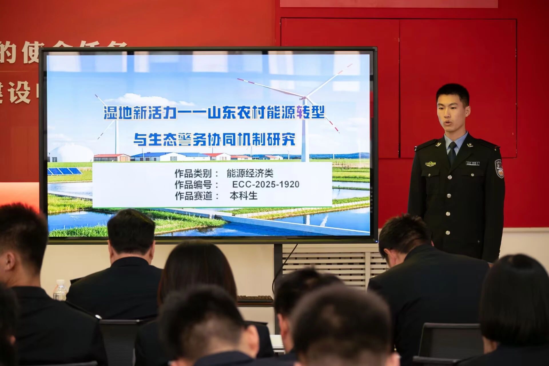 决赛现场,九支参赛队伍各展风采,围绕乡村振兴,低碳生活,新能源转型等实时热点,结合公安警务工作,对当下存在的问题,创新研究成果,以及未来的应用情况和重要意义进行了精彩的现场答辩。